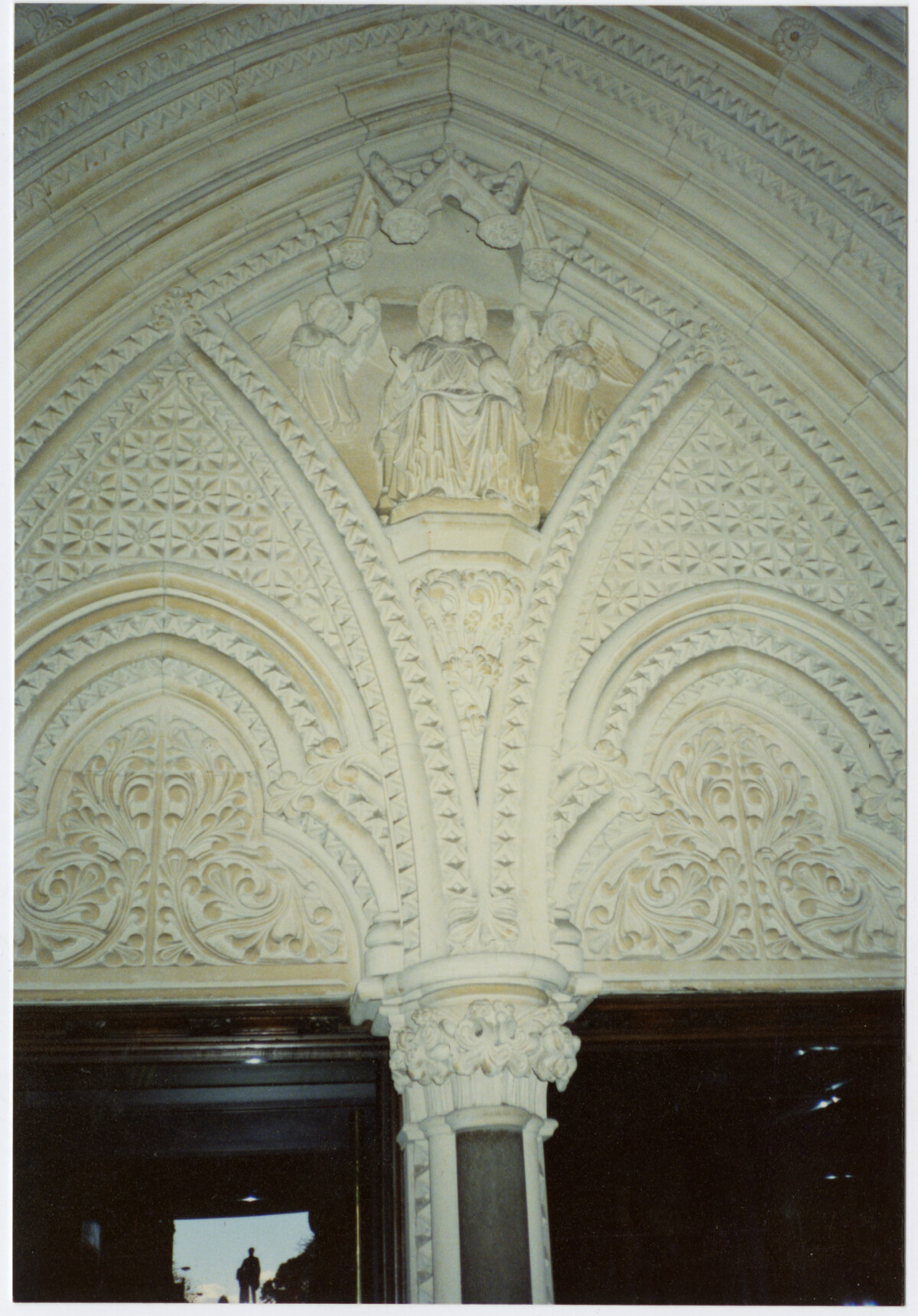 Stone detail above the porch entrance into ChristChurch Cathedral with the main entrance doors below.