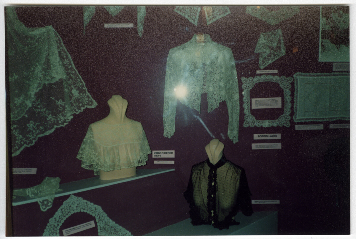 A display of period lace work and clothing in a cabinet.