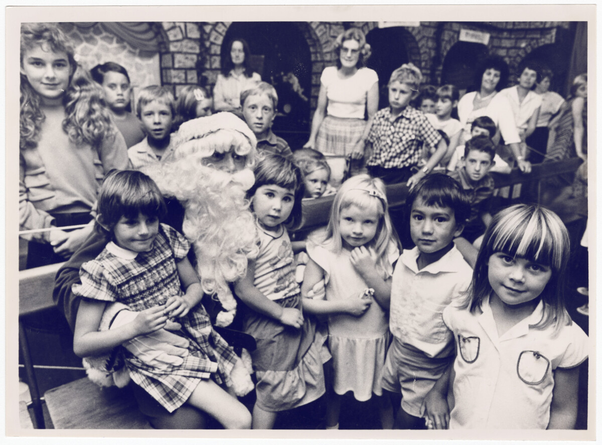 Santa Claus and children posing together at the Colombo Street Farmers department store.