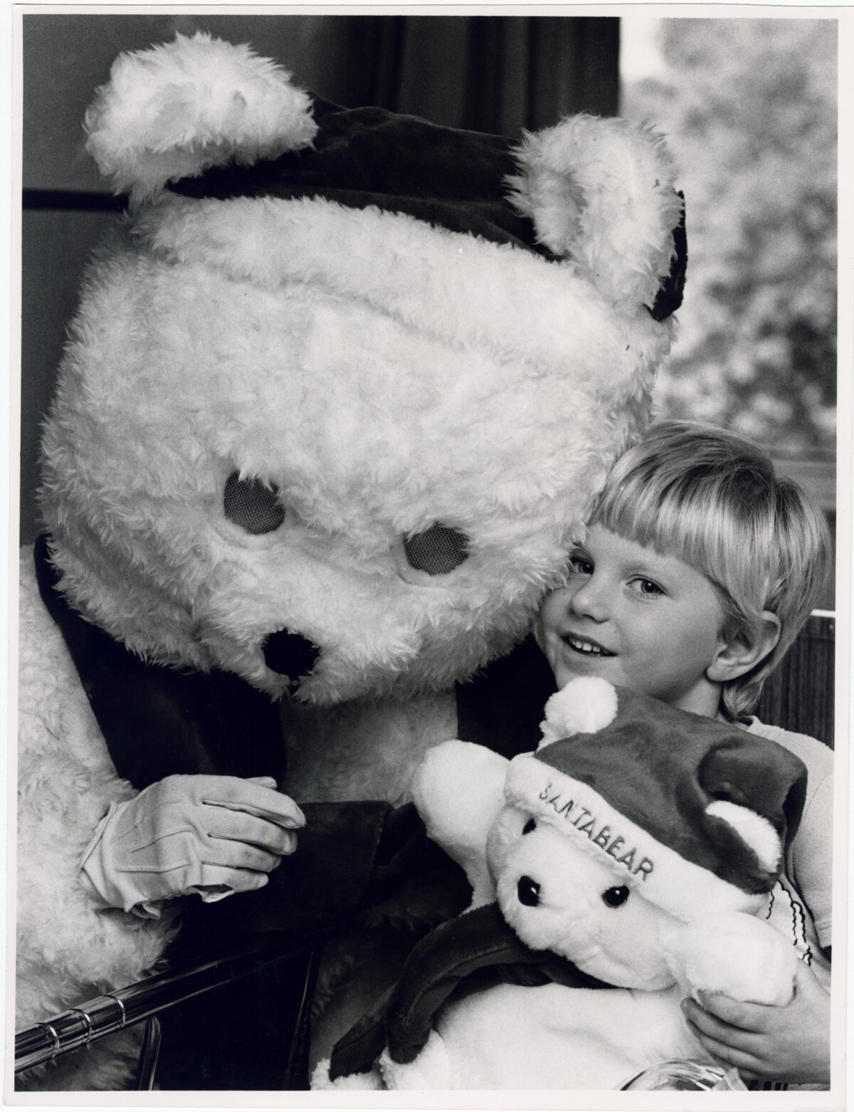 A child, Owen Crump, getting a hug and a toy Santa Bear from Farmers Department Store during a visit by Santa Bear to the children's ward at Christchurch Hospital.
