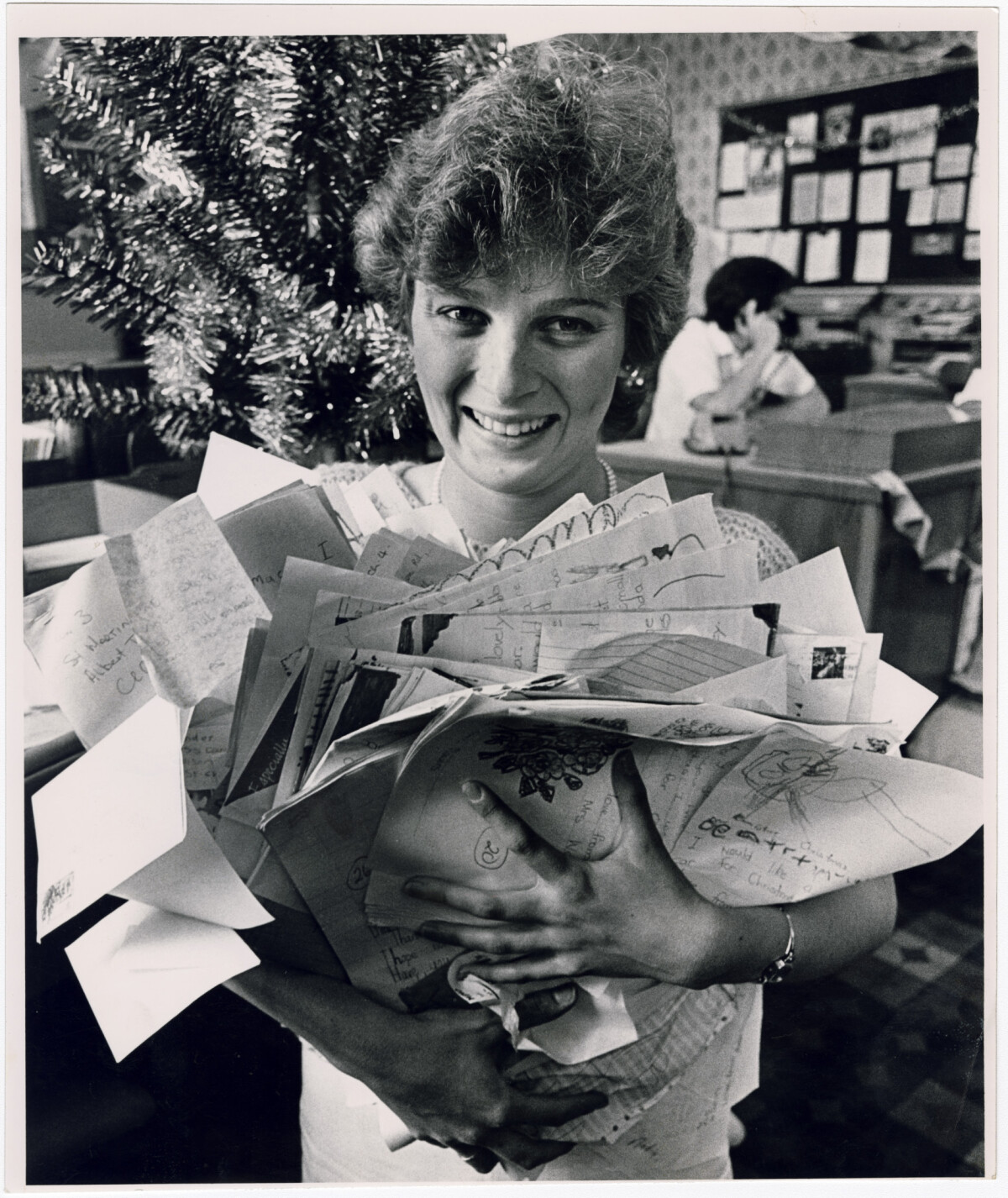 Margaret Zuurfeld of the New Zealand Post Office, with letters from children to be sent to Santa Claus.