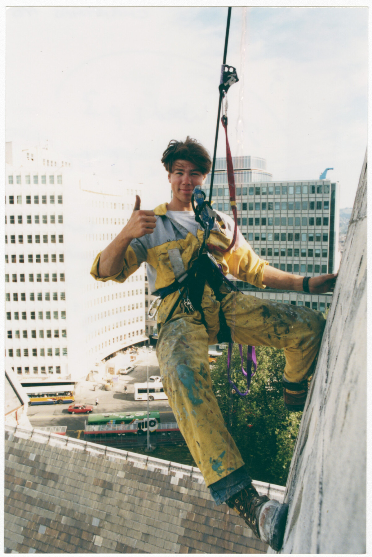 Luke Golemanov of the Abseiling Company, abseiling on the spire of ChristChurch Cathedral to install Christmas lights.