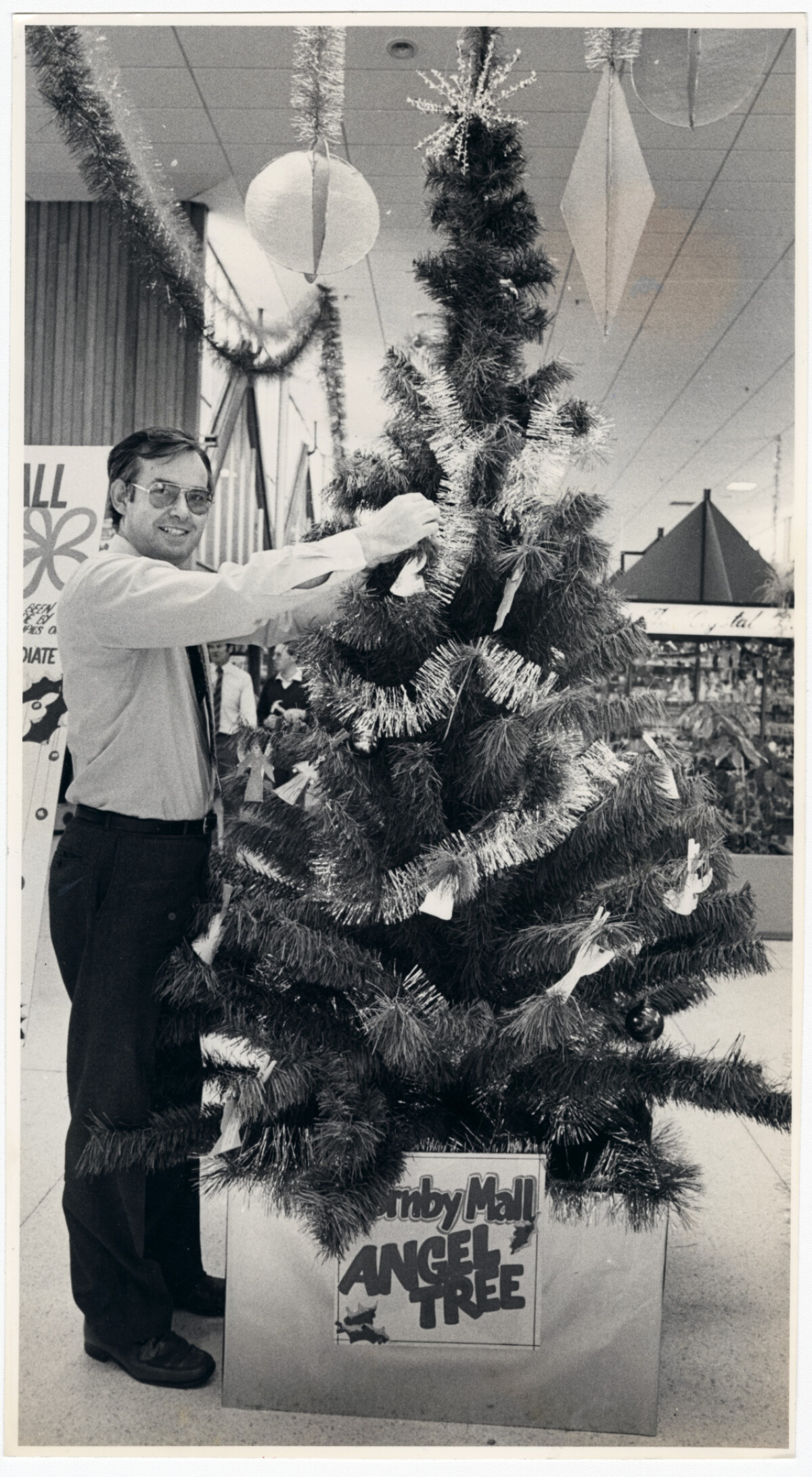 R.G. Morris, manager of Hornby Mall, placing angels on a Christmas tree as part of a programme in collaboration with the Mall Merchants Association. Children are invited to write an angel and hang it on the tree. Shoppers in the mall are encouraged to buy a present to match the information. The presents are then distributed to disadvantaged children in and around Christchurch.