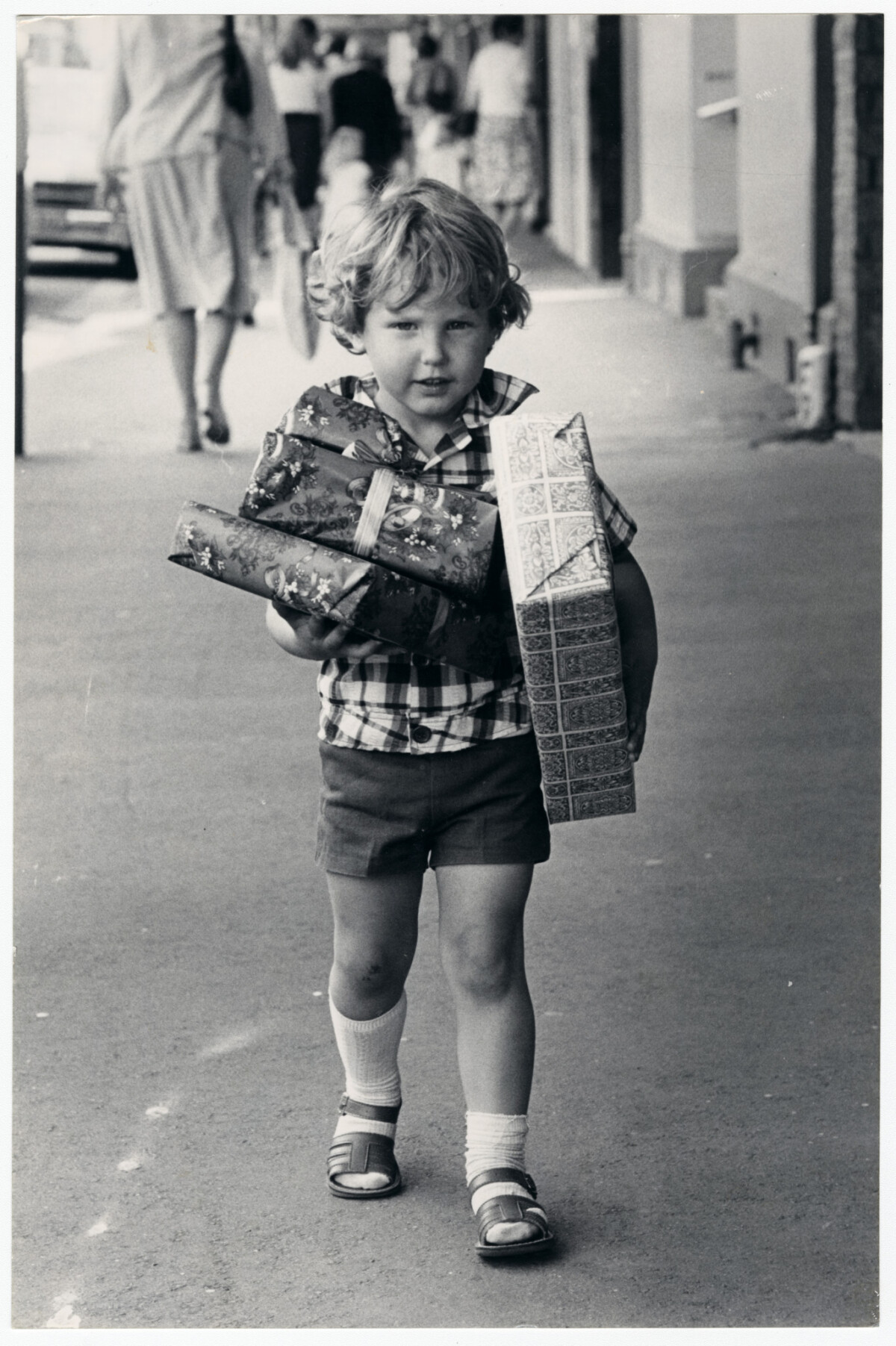 A child, Shaun Roberts, carrying his Christmas presents in the central city.