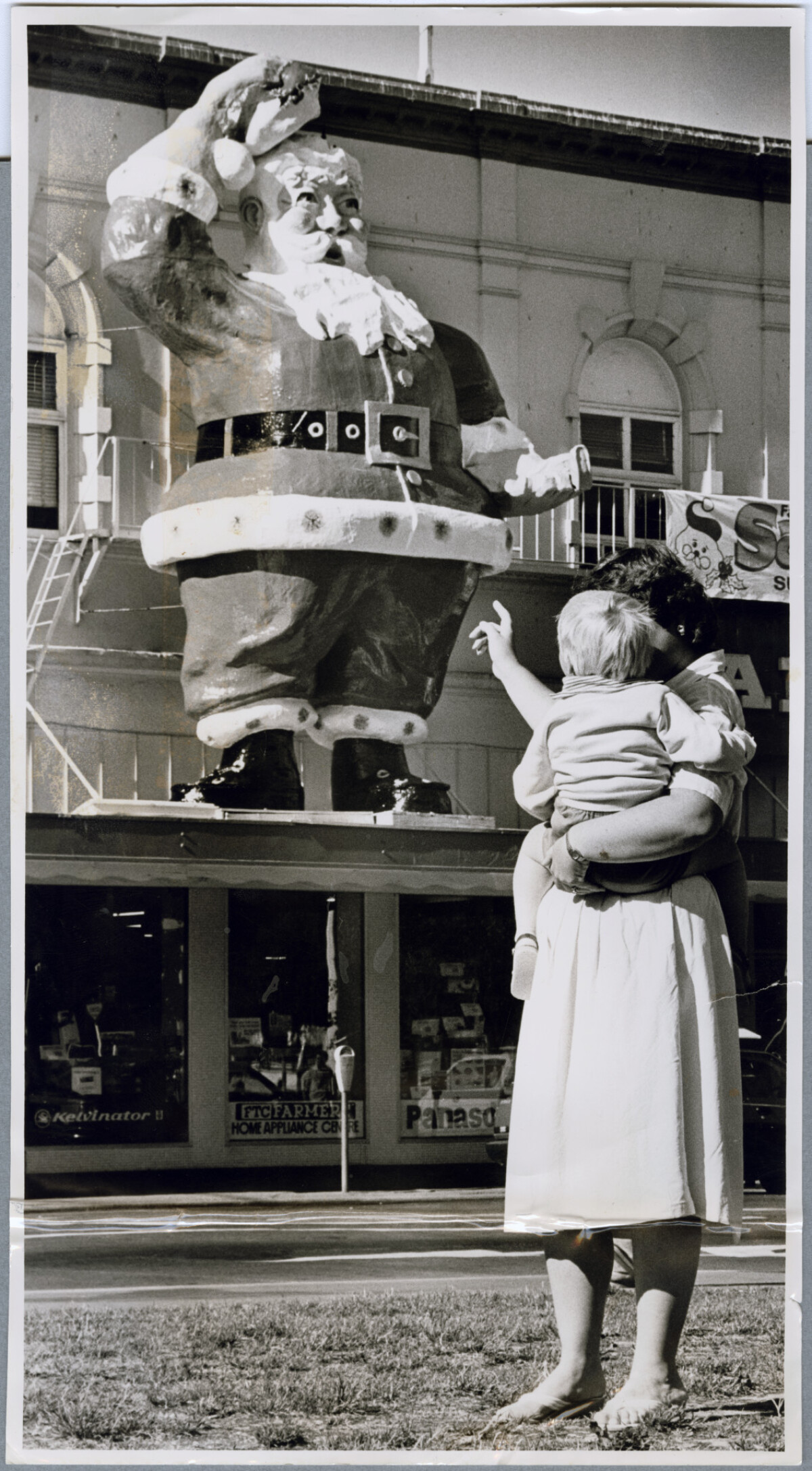 Christine Magon with her son David Magon, pointing to the Santa Claus above the entrance to Farmers Department Store on the corner of Armagh and Colombo Streets. The Santa has been reinstalled following a new coat of paint.