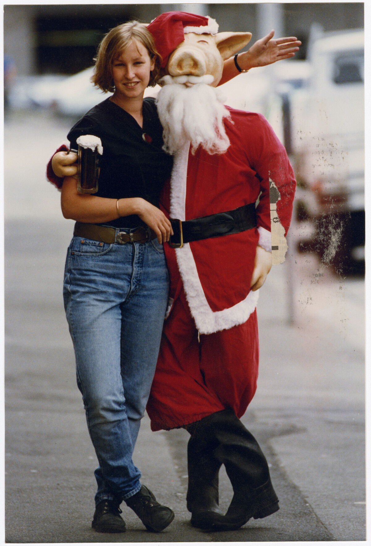Kate Rivers, bar staff member, with the owner of Hogshead Tavern in Dundas Street, Pete Hogshead, dressed as Santa Claus in a pig costume.