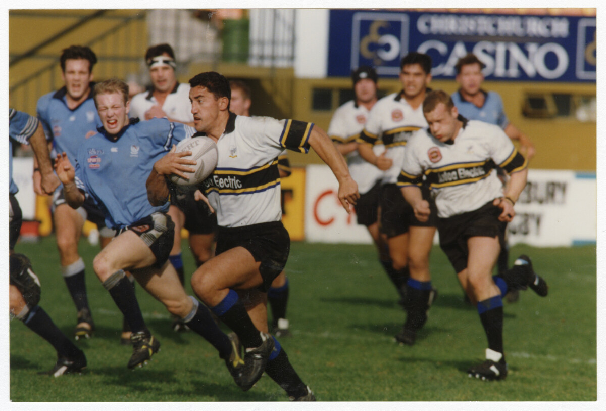 Captain of the Canterbury rugby team, Don Hayes, on the back of ...