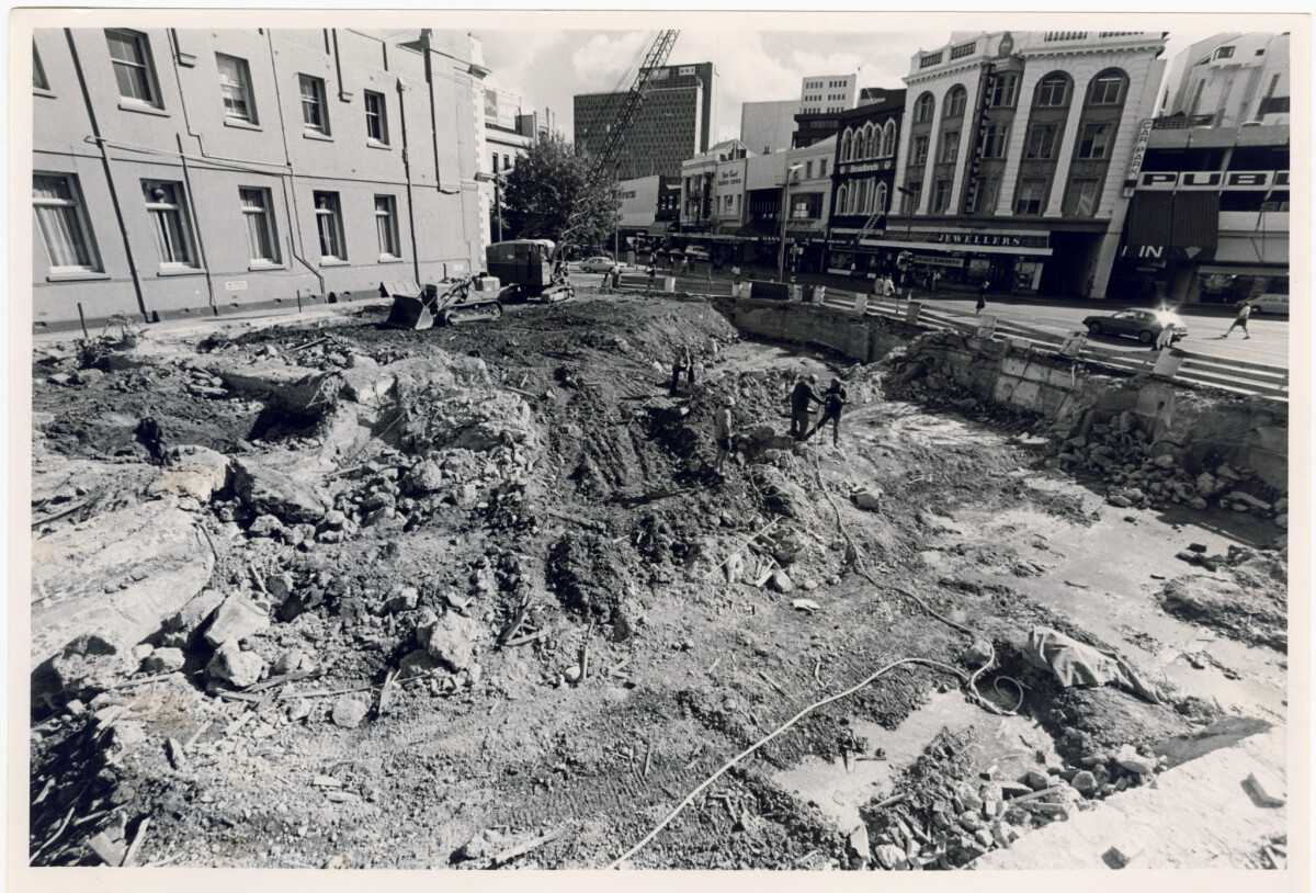 Construction site of the Canterbury Savings Bank building on the corner of High Street and Cashel Street.