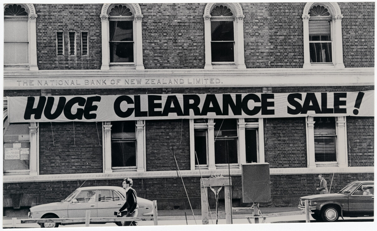 Clearance sale sign on the National Bank building on the corner of Manchester and Hereford streets. The sign belongs to a business using the building following the bank moving to another location.