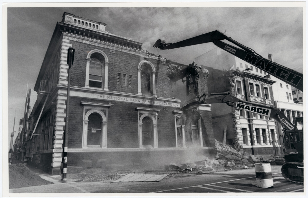 Demolition of the National Bank on the corner of Manchester and Hereford streets.