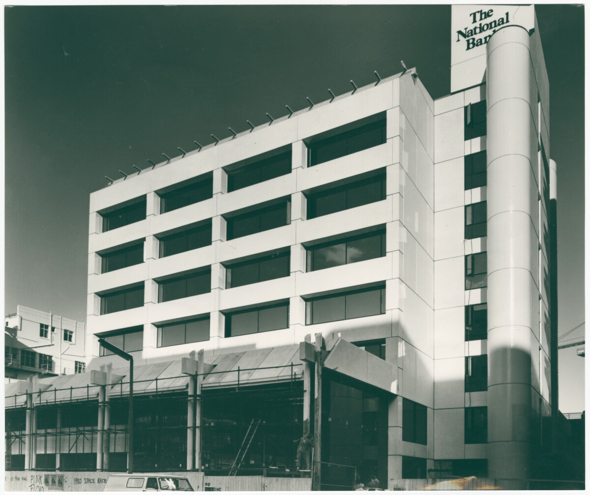 Exterior of The National Bank building on Hereford street during the final stages of construction.