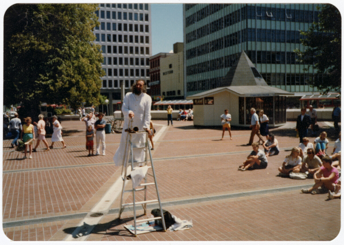 The Wizard of Christchurch on a ladder in Cathedral Square.