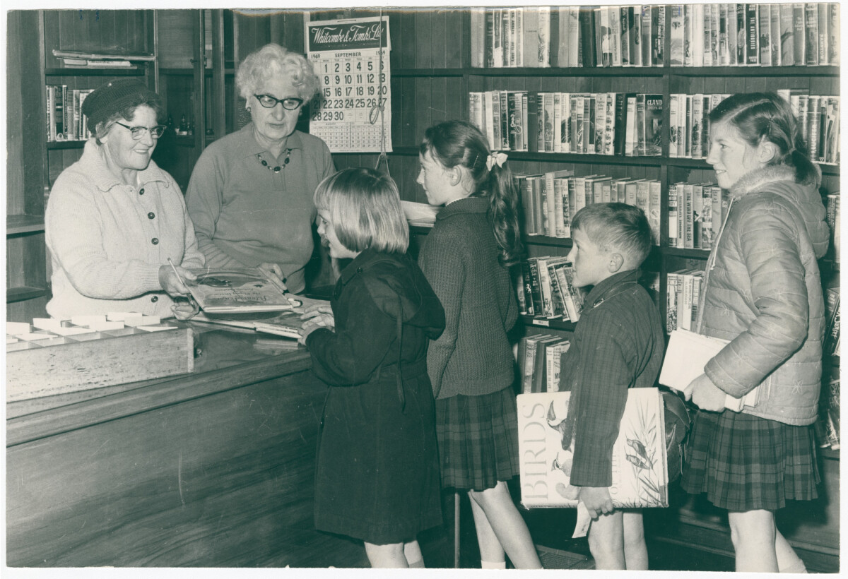 Interior of Beckenham Public Library with librarians, G. Mackley and R. M. Jennings issuing books to children. Children are, from left, Karen Russell, Christine Stedman and John Noonan.