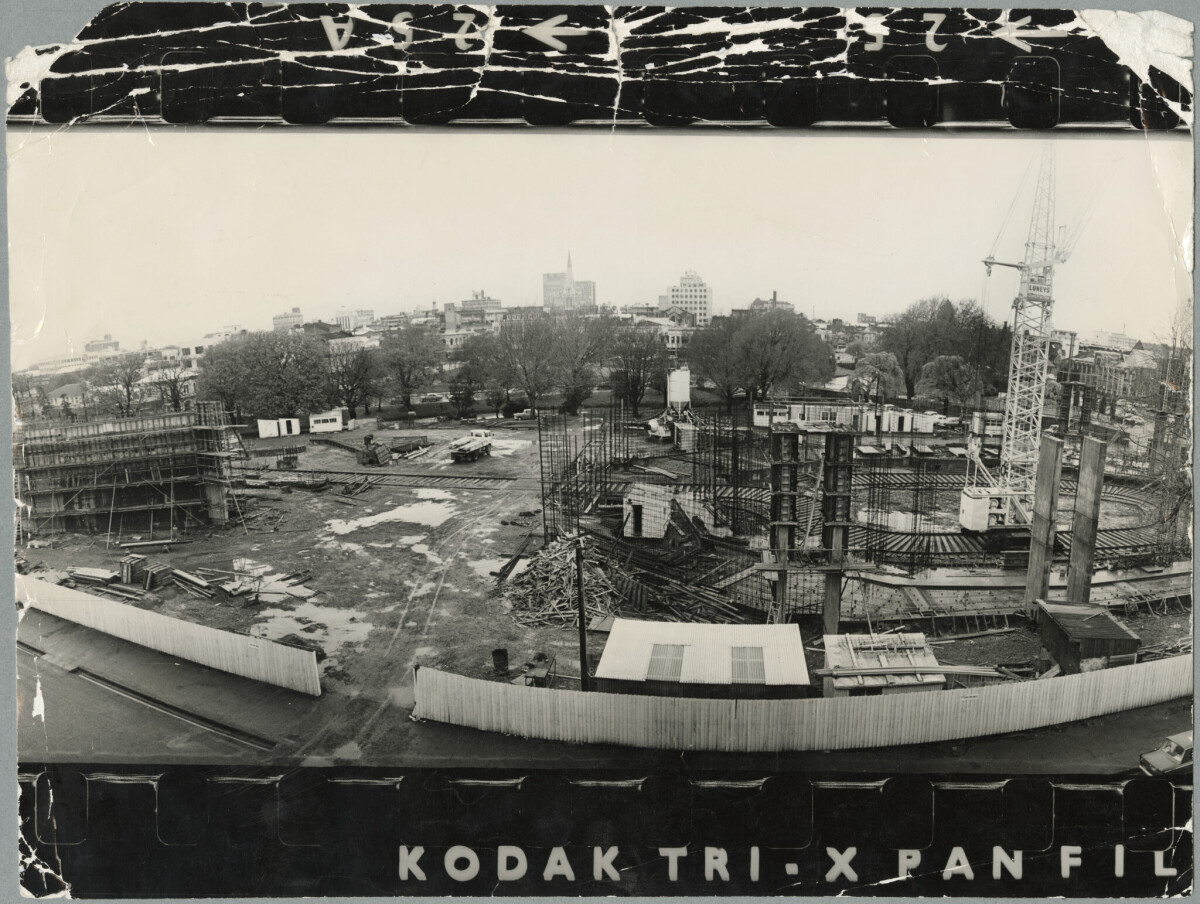 A view of the Christchurch Town Hall construction site looking south taken from the Christchurch Star offices.