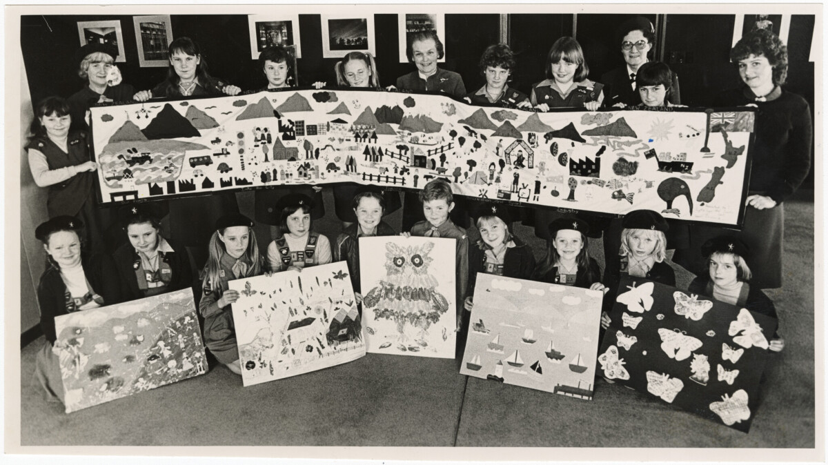 A group of brownies, guides and their leaders from Lyttelton with artwork they have created for Canterbury's sister province in China. In the centre is the Mayoress, Lady Hay. The art depicts New Zealand and its way of life including sheep farming, mountains and wildlife such as a kiwi, owl and butterflies.