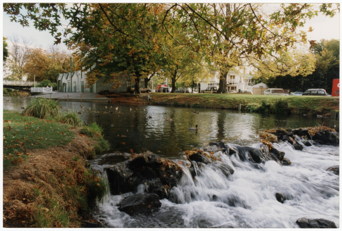 Antigua weir on the Avon River with the Antigua Boatsheds and Cambridge Terrace in the background.