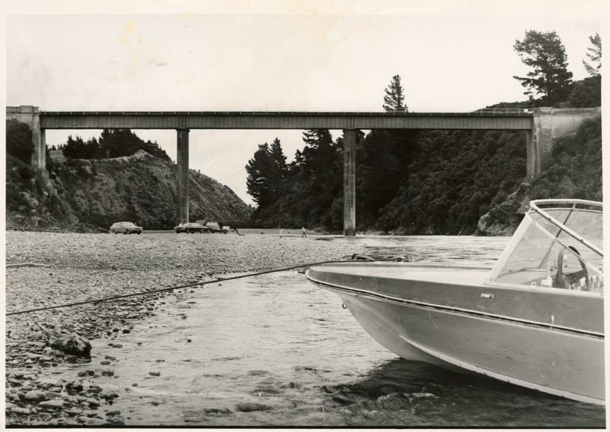 A jet boat and Waimakariri Gorge bridge.