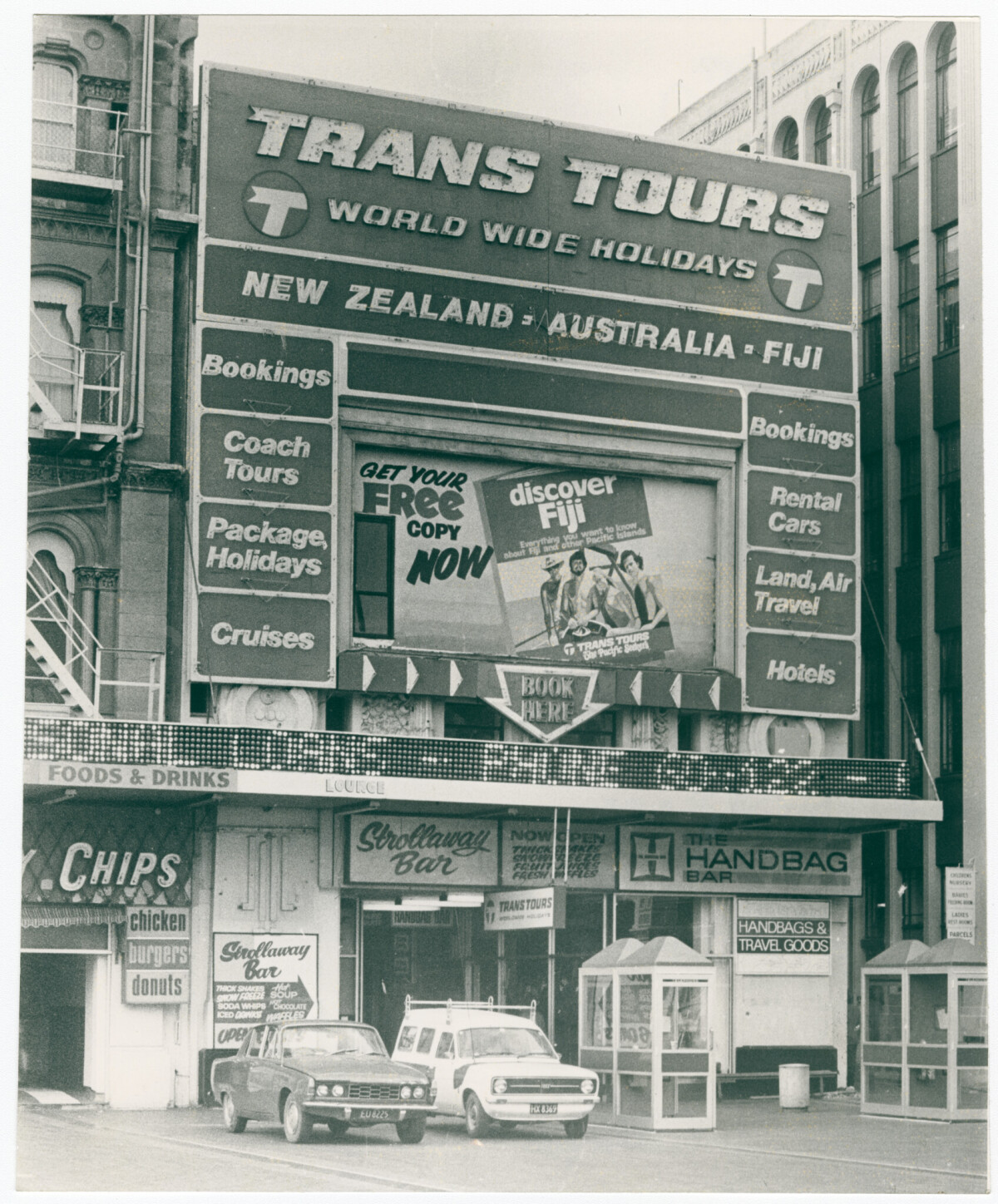 Exterior of the former Plaza Theatre due to be converted into a recreation centre and meeting place for the Centrepoint club for women. Above the entrance is an advertisement for Trans Tours.