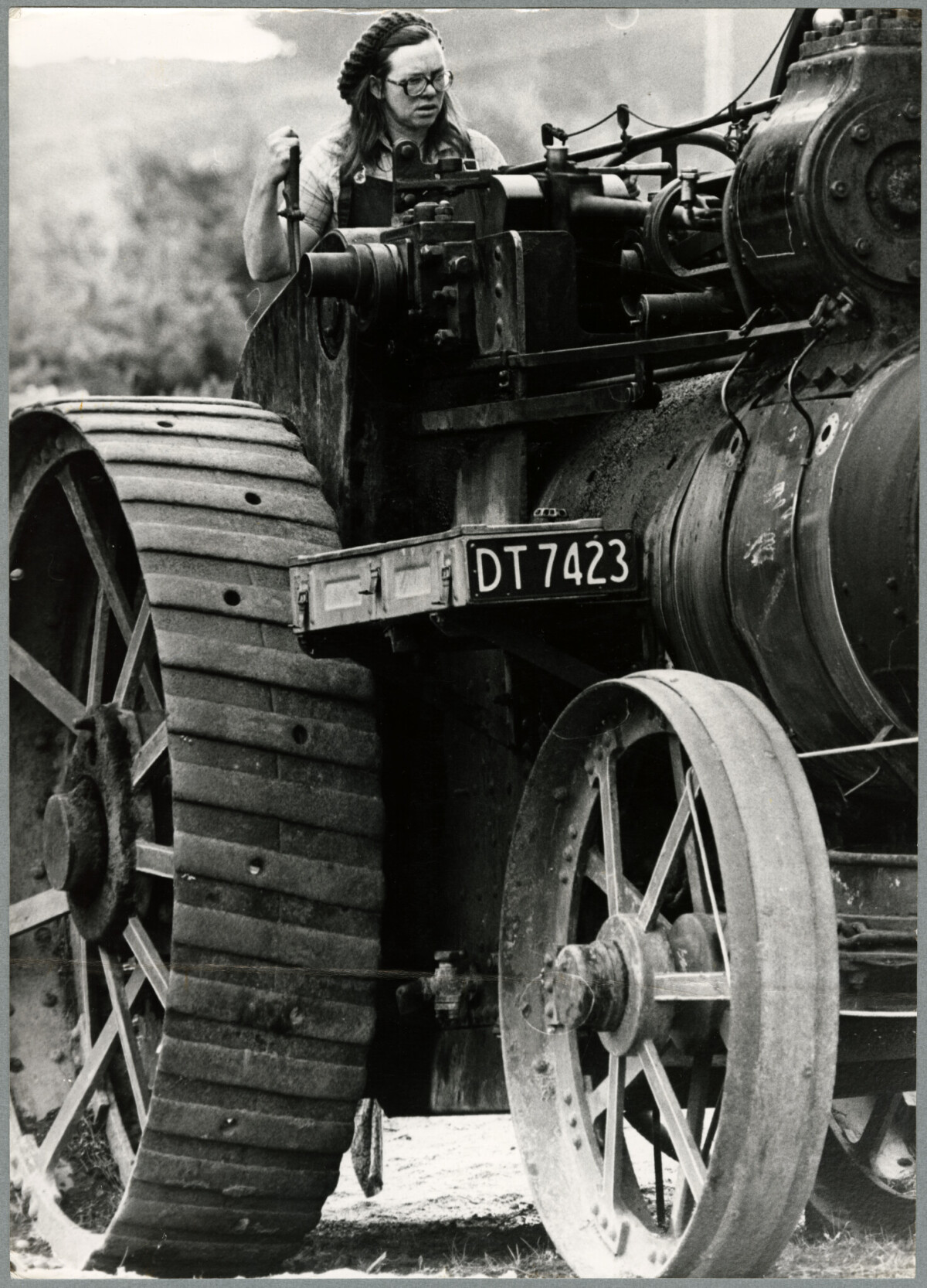 Lallie Eaves driving a traction engine on her families land at Windwhistle near Mount Hutt.