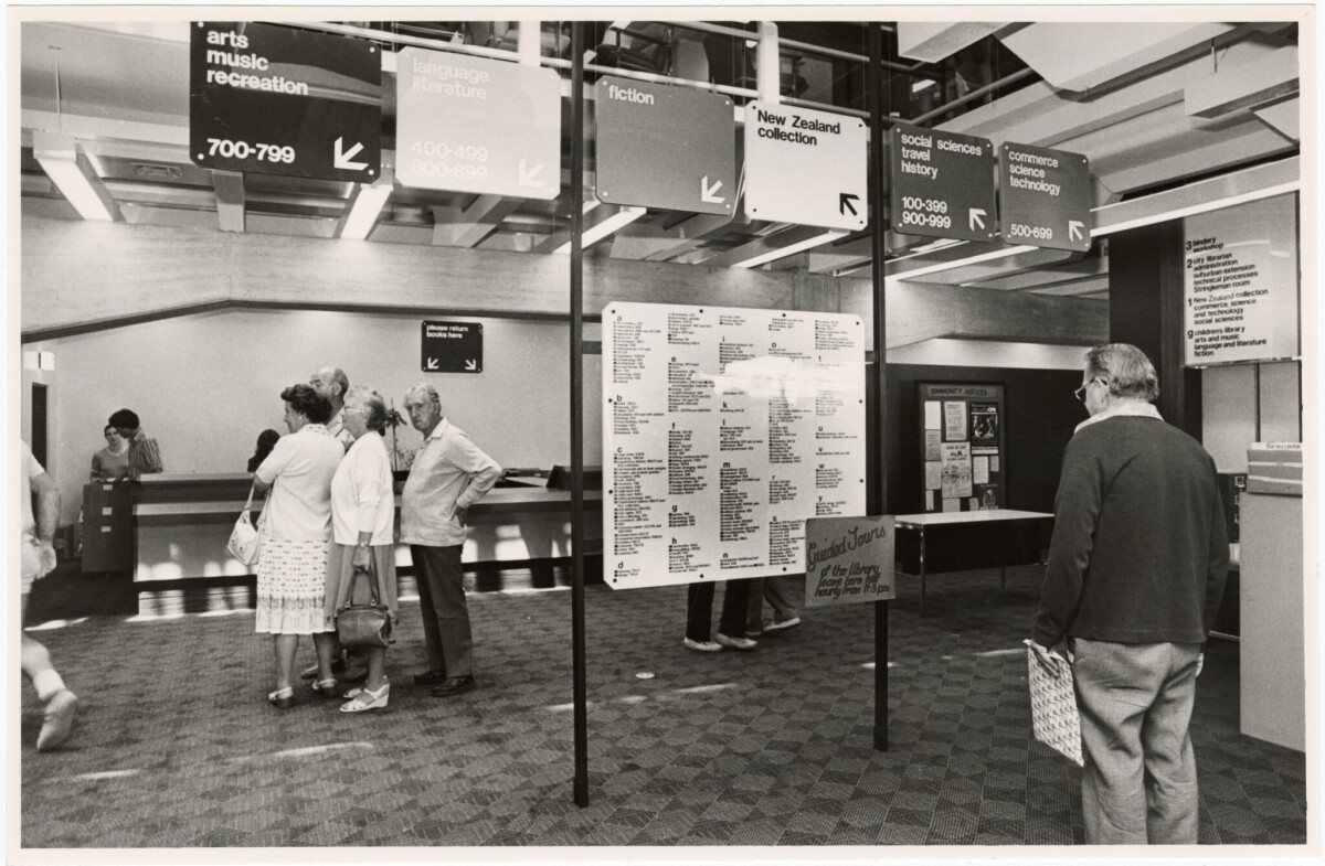 View of the directory boards and signage being viewed by customers in the main entrance to the Canterbury Public Library.