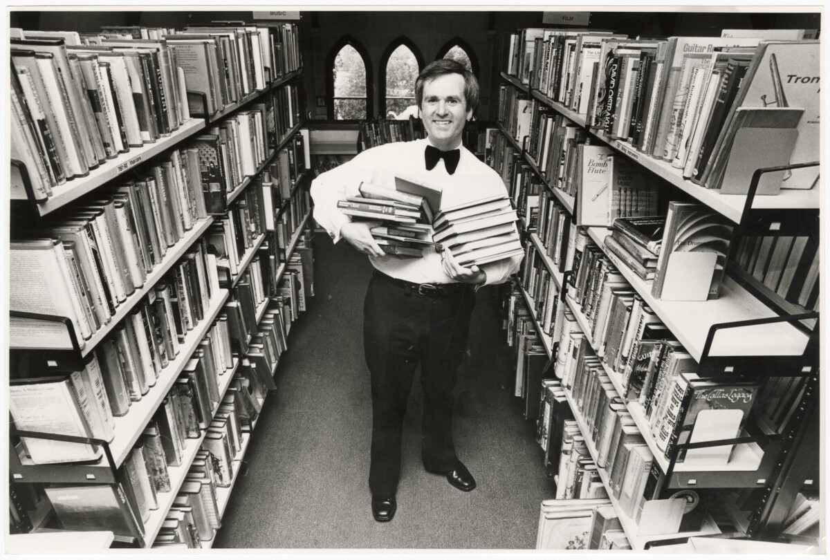 Librarian, Roger Flury, holding books on the day the former Canterbury Public Library on the corner of Hereford Street and Cambridge Terrace closed ahead of the new building opening on Gloucester Street.