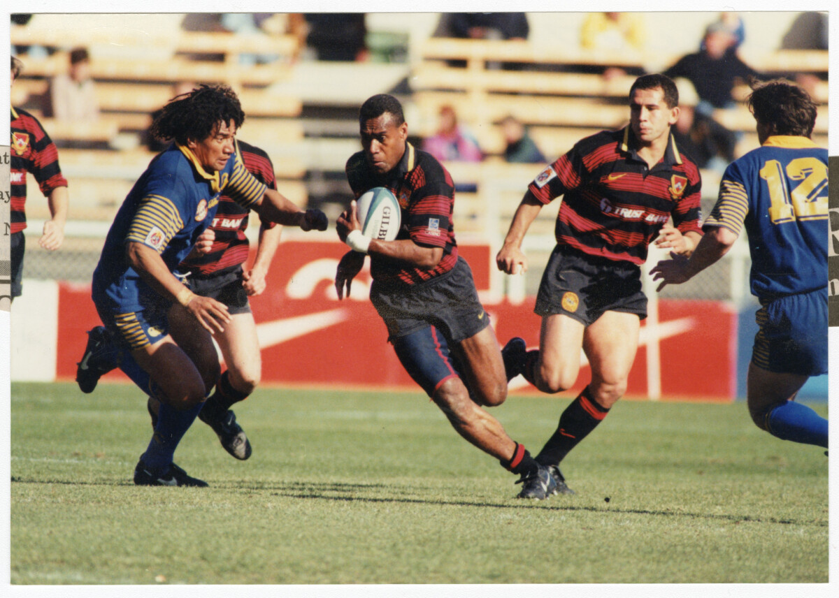 Gameplay action of Canterbury winger Paula Bale dodging between Otago's Kupi Vanisi and John Leslie during a rugby match at Lancaster Park.