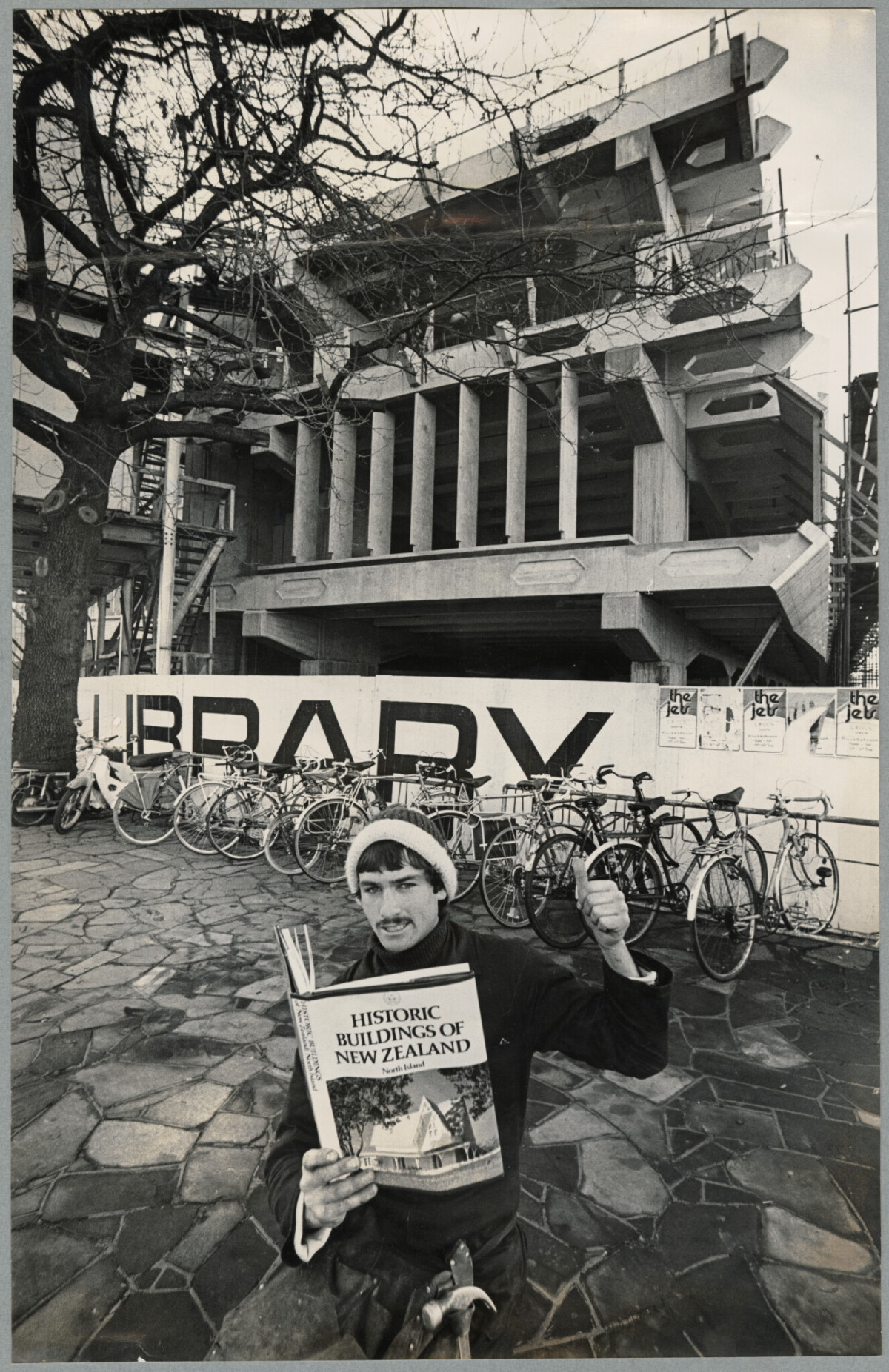 Dean Stevenson, a carpenter, stood outside the Canterbury Public Library under construction on Gloucester Street. He is holding a Historic Buildings of New Zealand book as he hopes one day the library building will feature.