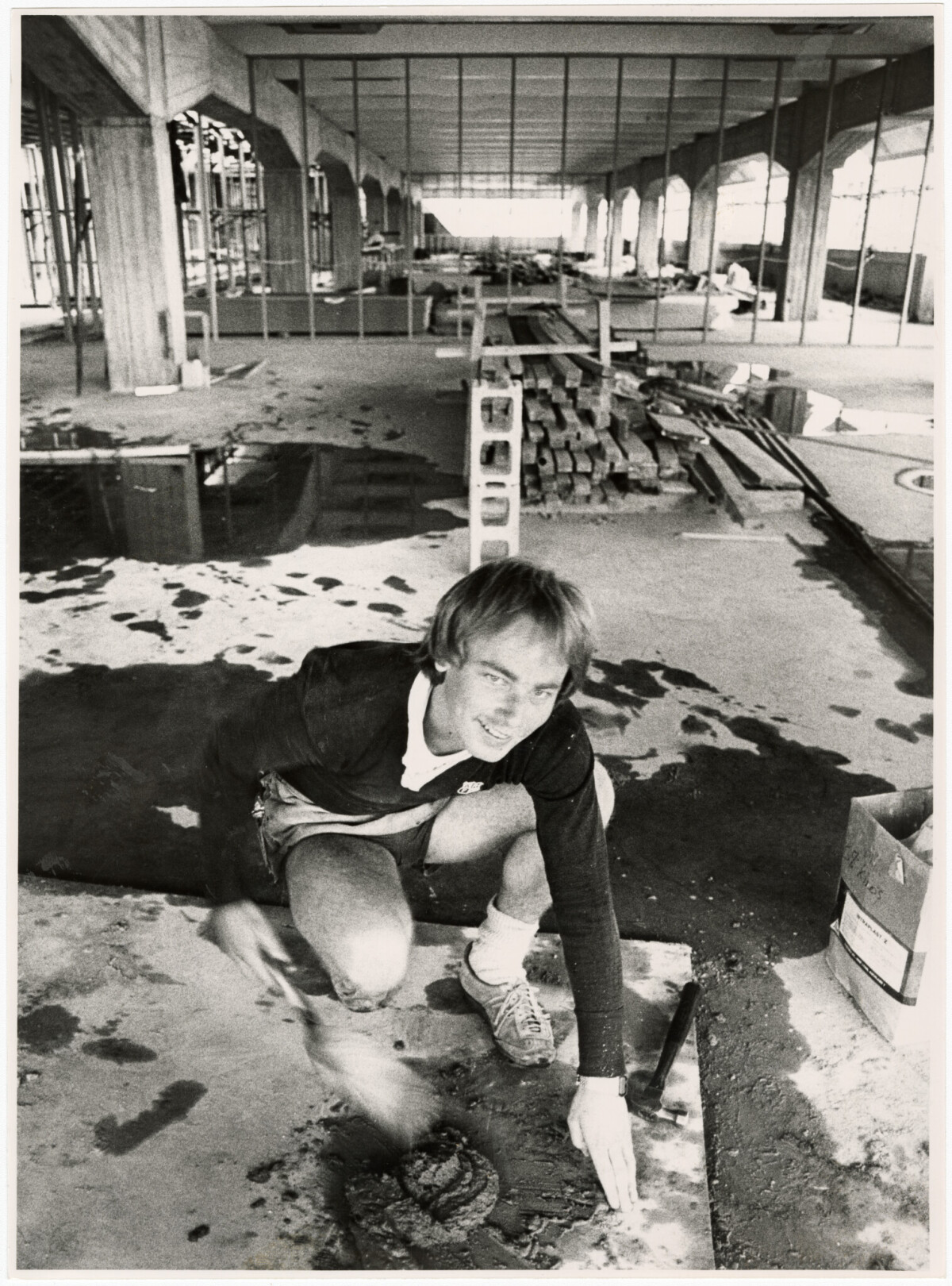 Kerry Earl, an apprentice carpenter, mixing cement inside the new Canterbury Public Library during its construction.