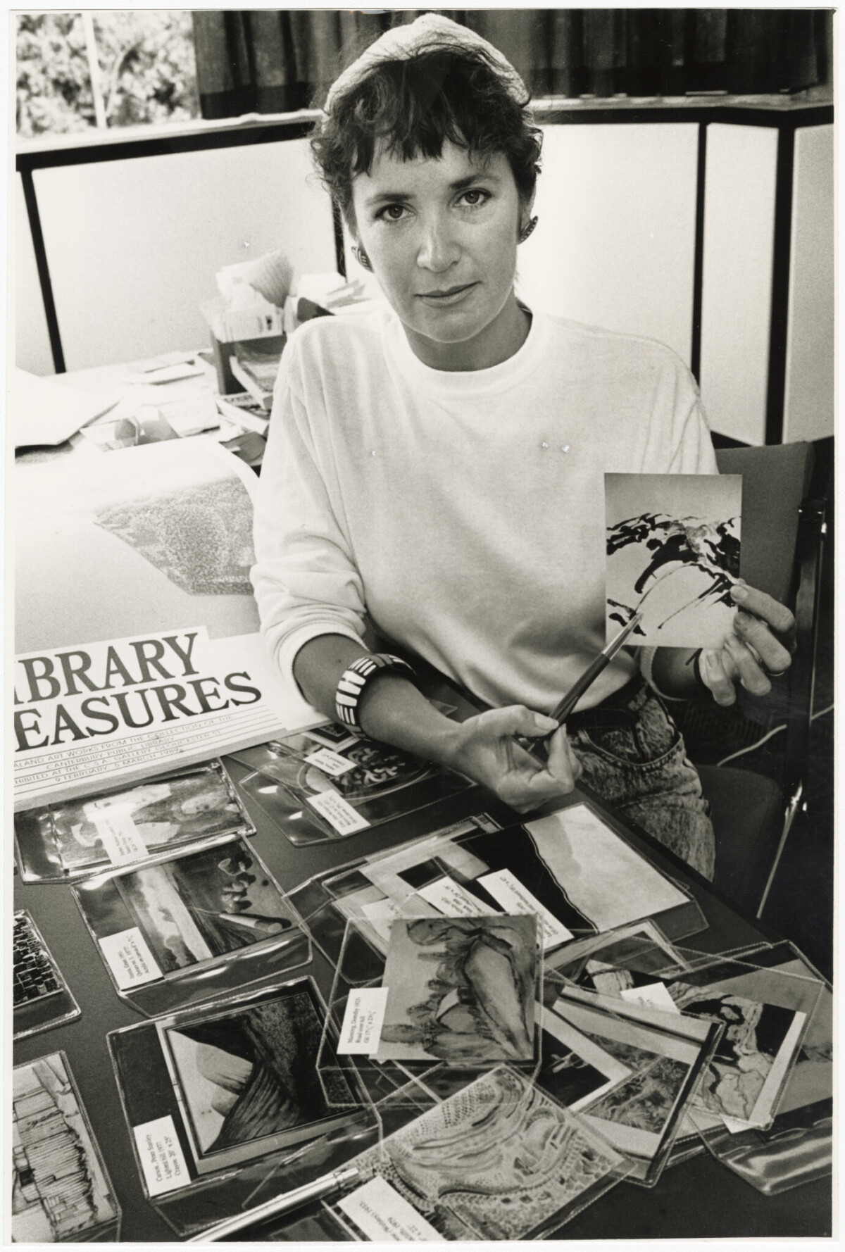 Sarah Benzie, library assistant at Canterbury Public Library, with photographs of missing paintings. The paintings had been borrowed by library members over a number of years and never returned. The aim of the campaign is to see the, now valuable, art returned to the library.