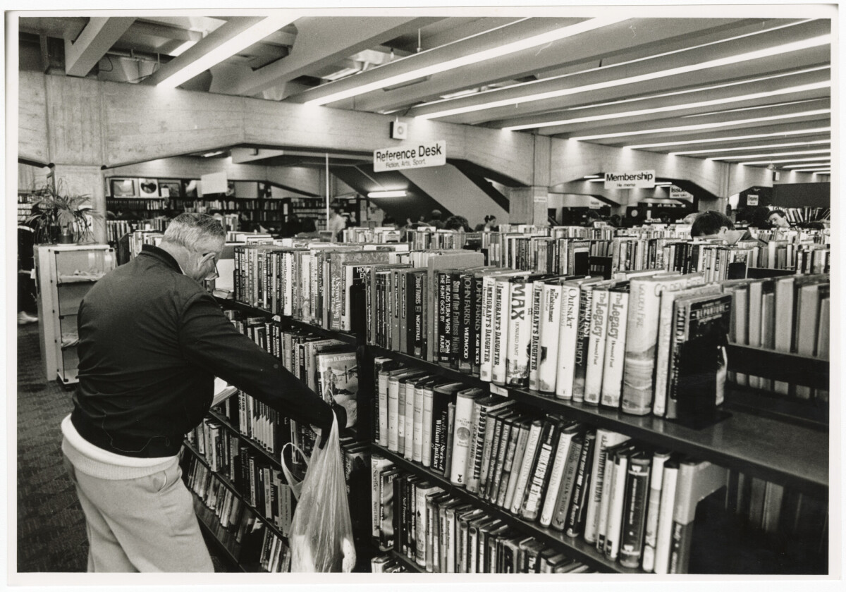 A customer looking at books on shelves in the Central Library on Gloucester Street.