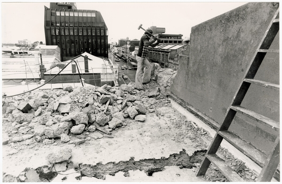 Construction worker demolishing part of a building on the site marked for the Canterbury Public Library on the corner of Gloucester Street and Oxford Terrace.