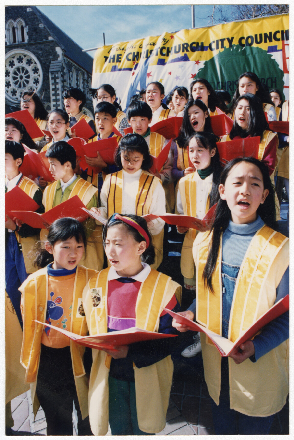 Buddha Light International Group singing traditional Chinese songs in Cathedral Square. The event is hosted by the Christchurch Chinese Society within the Christchurch City Council regular entertainment programme.