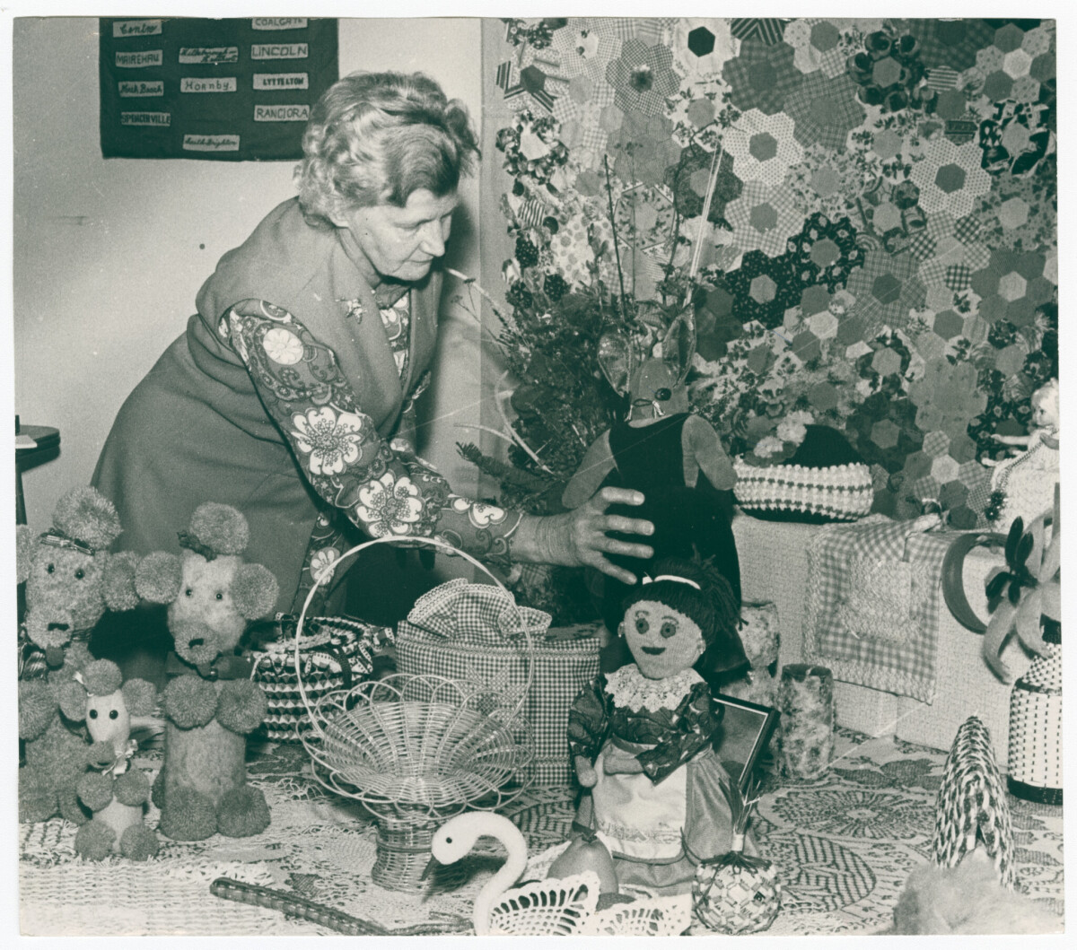 C. Pilgrim of the Bryndwr branch of the Canterbury Country Women's Institute arranges an exhibit at the Canterbury Building Centre on Cashel Street.