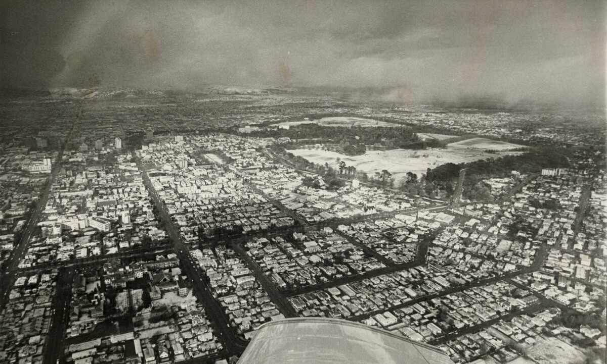 Aerial view of central Christchurch looking south over Moorhouse Avenue and Hagley Park.
