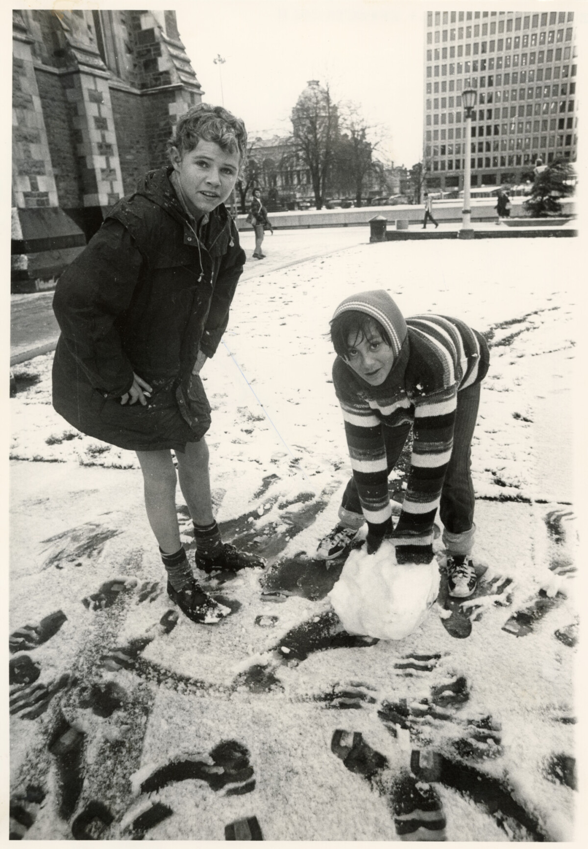 Michael Hakes and Manu Manihera in the snow in Cathedral Square.