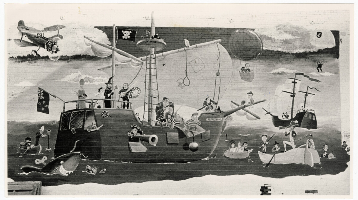 Mural in St Asaph Street with Canterbury characters including the Wizard of Christchurch.