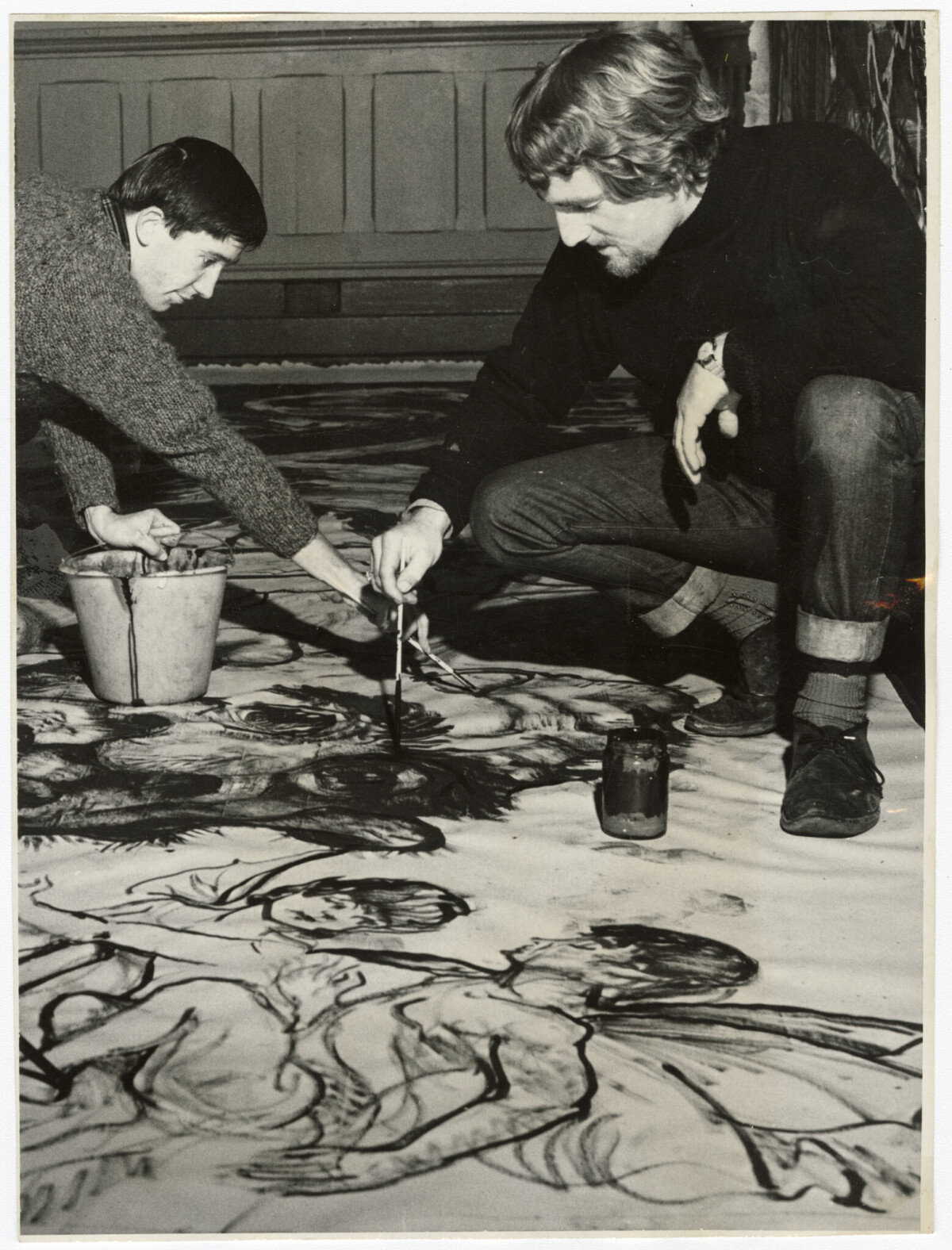 Barry Cleavin (left) and Dick Frizzell painting Shakespeare themed murals for the Fine Arts Ball at the Durham Street Art Gallery.