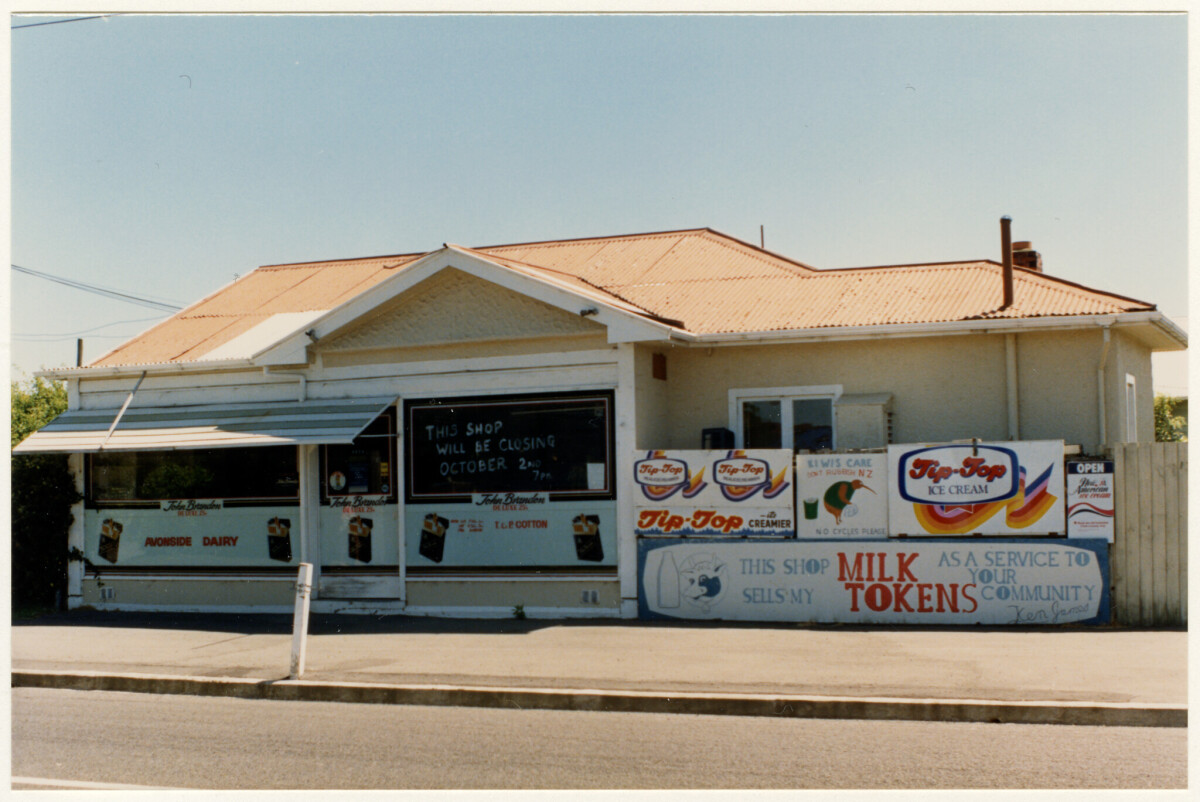 Exterior of the former Avonside Dairy following closure at 4 Bracken Street. A sign advertising the closure of the dairy and others including Tip Top and milk tokens are along the outside of the building.