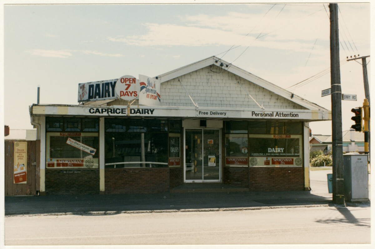 Exterior of the Caprice Dairy at 615 Ferry Road on the corner with Hargood Street in Woolston.