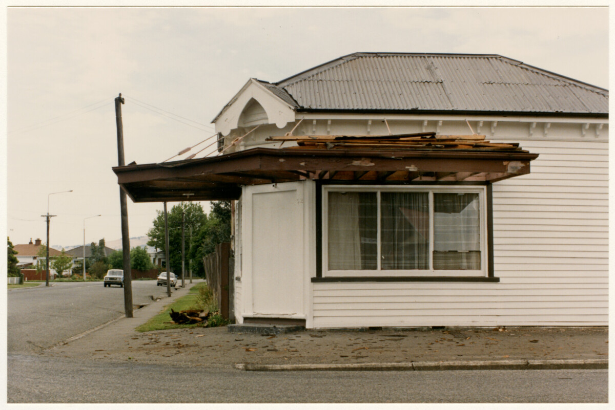 Exterior of a residential house converted from a shop with a damaged veranda at 52 Berwick Street on the corner with Forfar Street in St Albans.