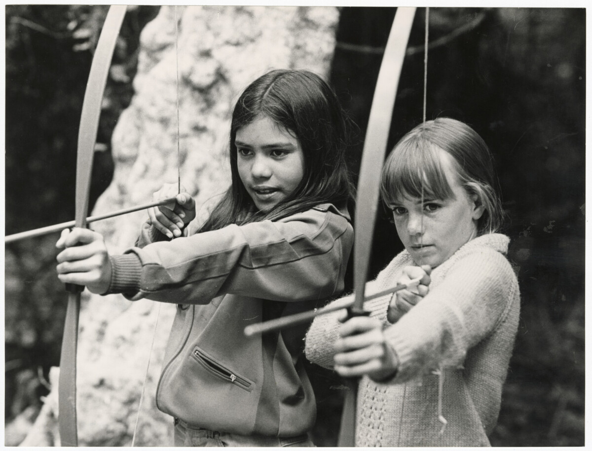 Anna Faoagali (left) and Jennifer Harwood aiming their bows at the YMCA camp, Wainui.