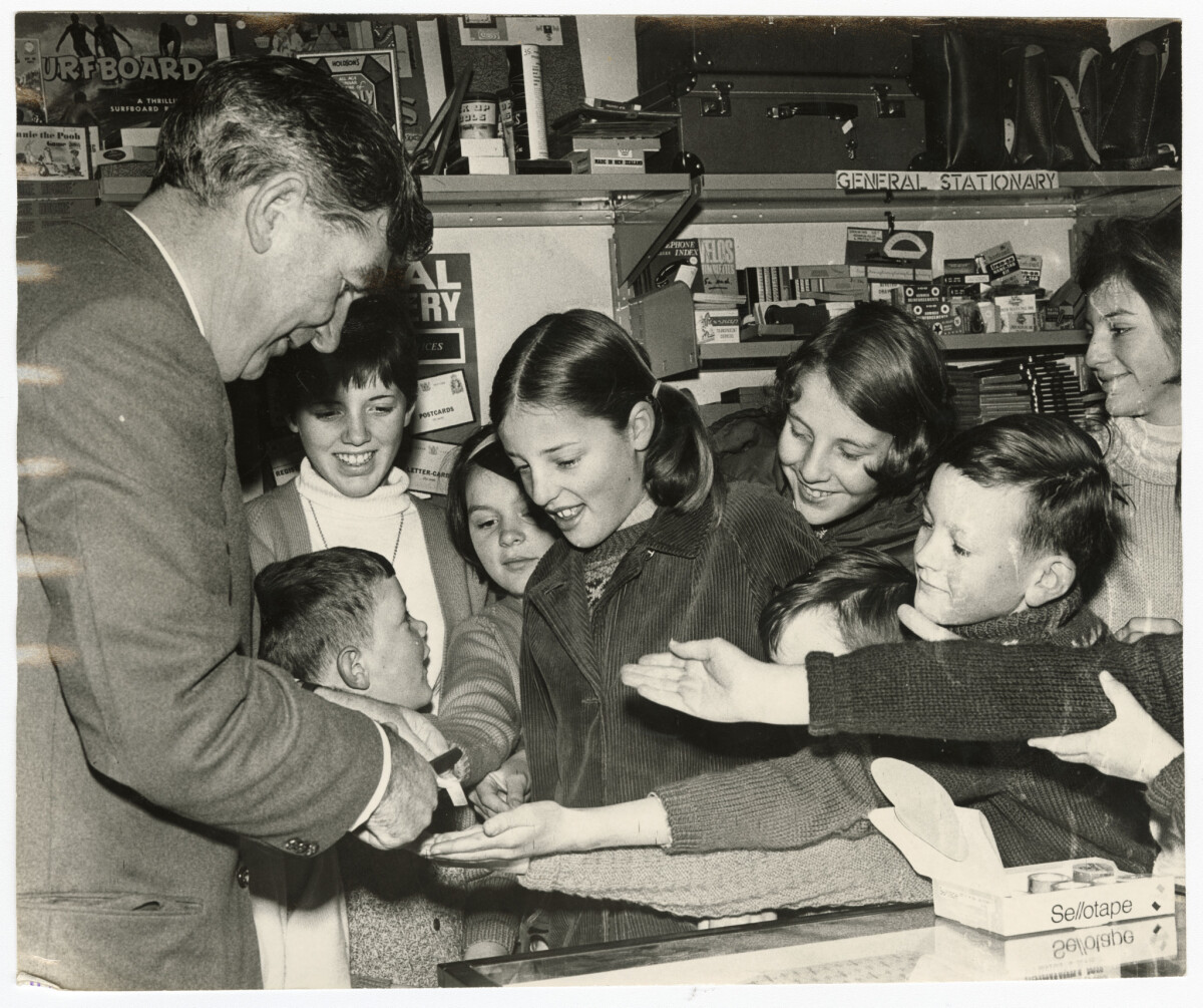 Mr M.A. Connelly M.P. for Riccarton officially opening the Merrin Post Office on Withells Road, Avonhead. Mr Connelly is shown cutting strips of ribbon to give to local children inside the post office.