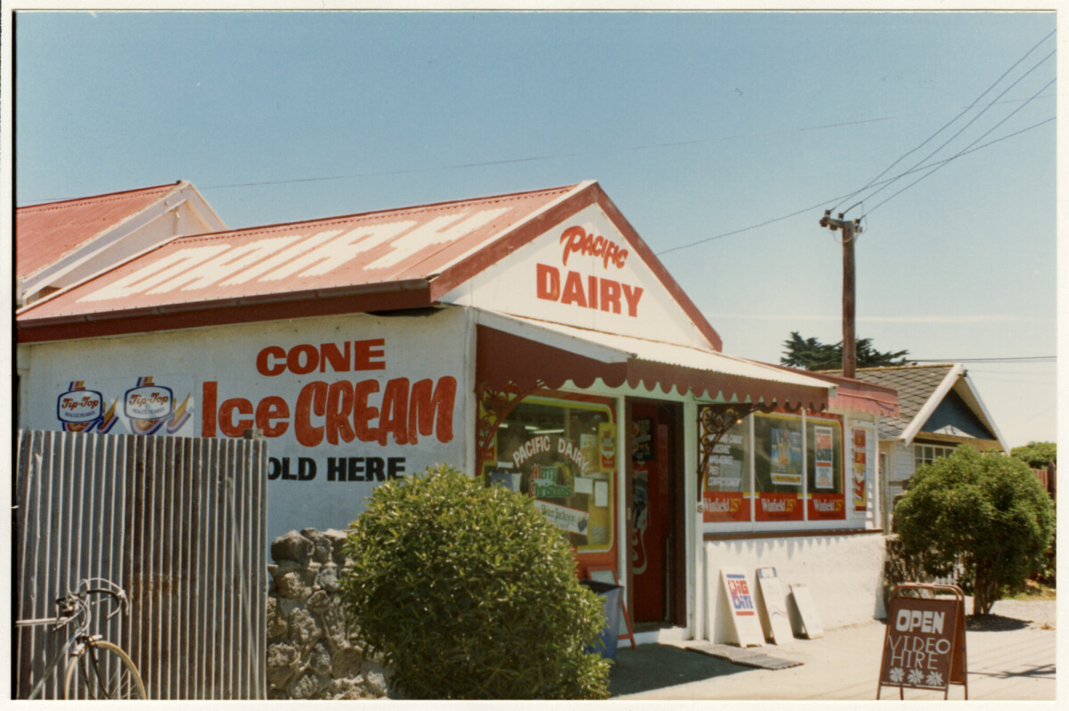 Exterior of Pacific Dairy at 49 Marine Parade in North New Brighton. Advertising for Tip Top ice cream is on the side of the building and an a-frame sign advertises video hire.