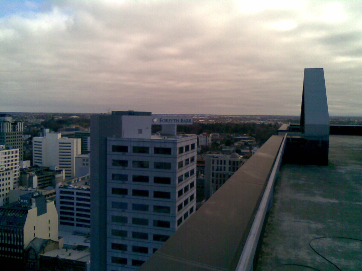 View from Pricewaterhouse Coopers Building roof top at 118 Armagh Street. Looking southwest across the central city towards the Forsyth Barr building.