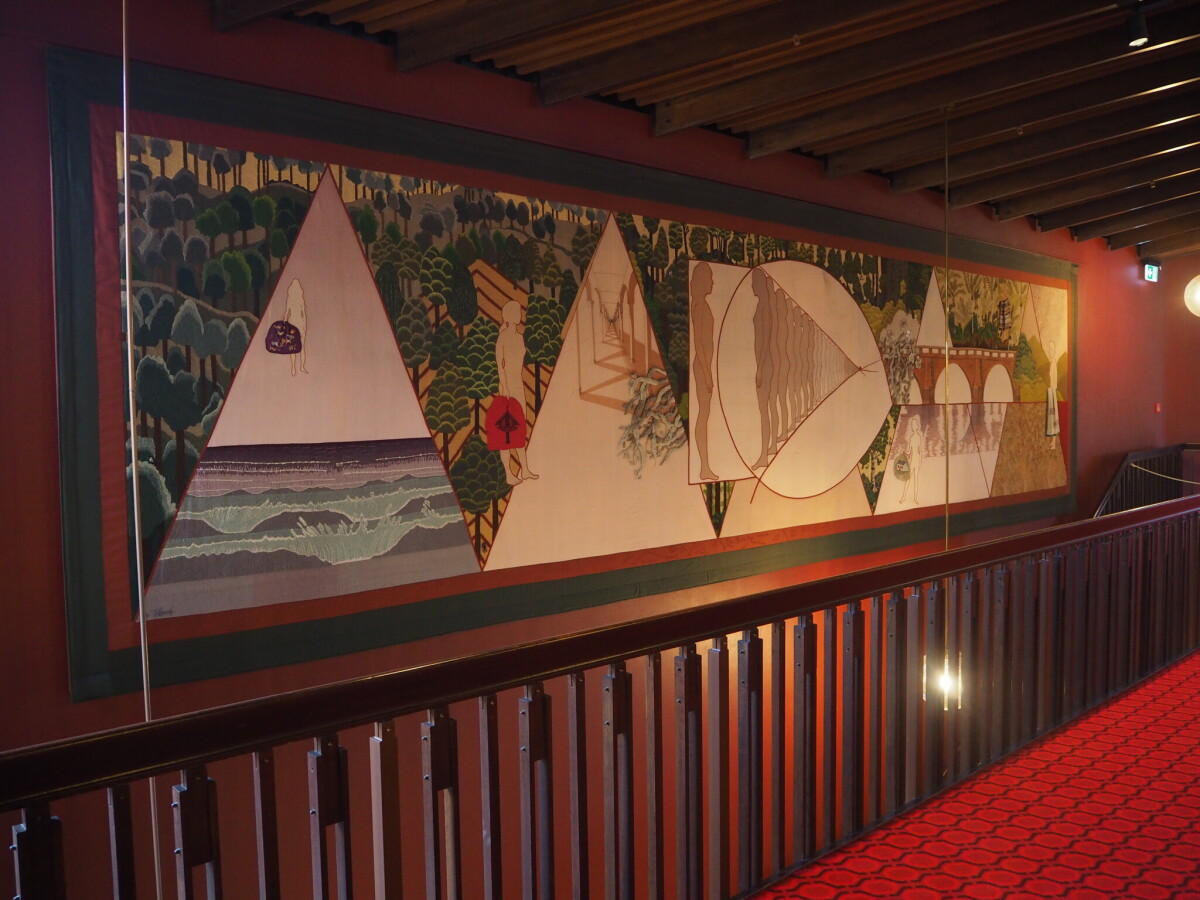 The Women’s Suffrage Commemorative Wall Hanging at the Christchurch Town Hall during the re-opening weekend. Based on a design by Di French and embroidered by Members of the Canterbury Embroider’s Guild in 1993, which was the centennial year of women winning the right to vote in New Zealand.
