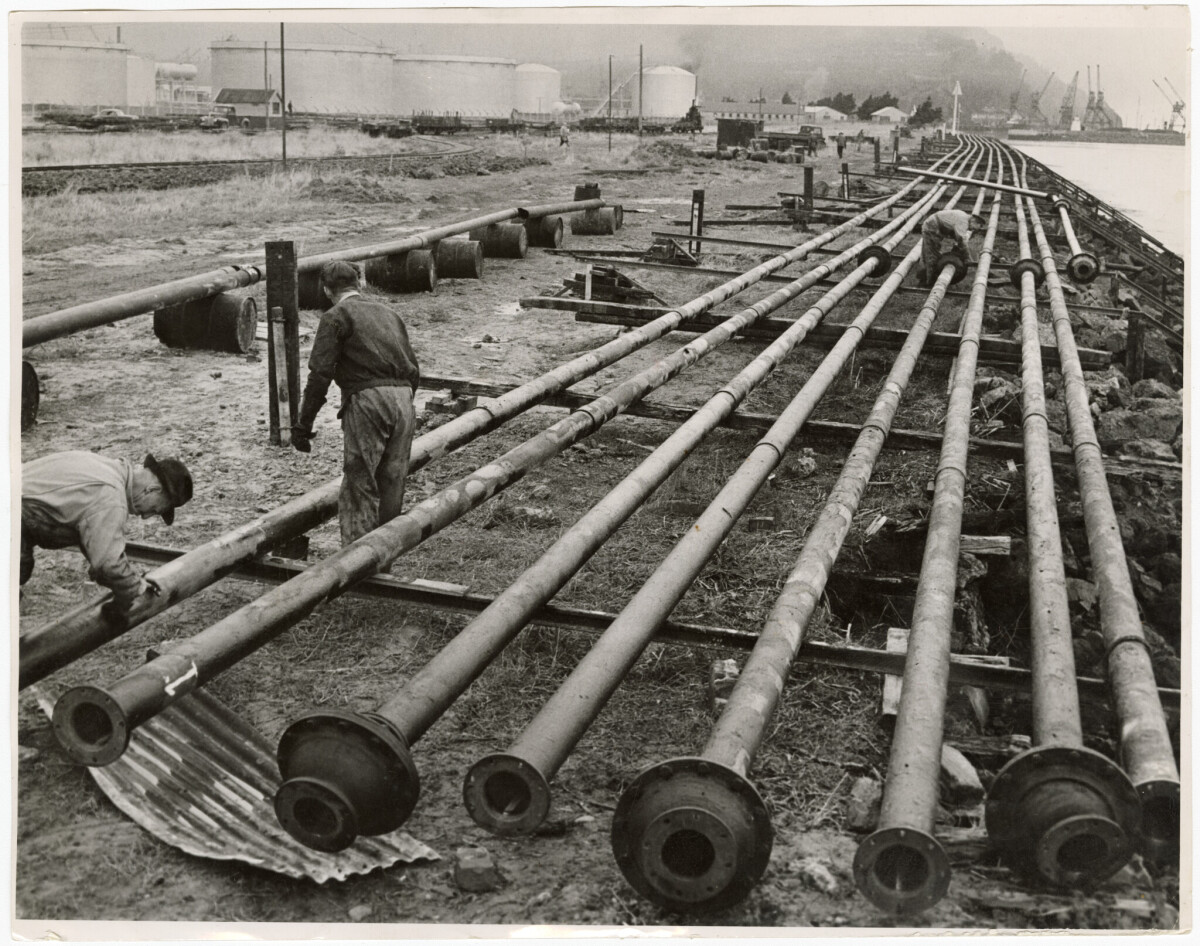 Pipes for a water scheme laid out at Lyttelton Harbour.