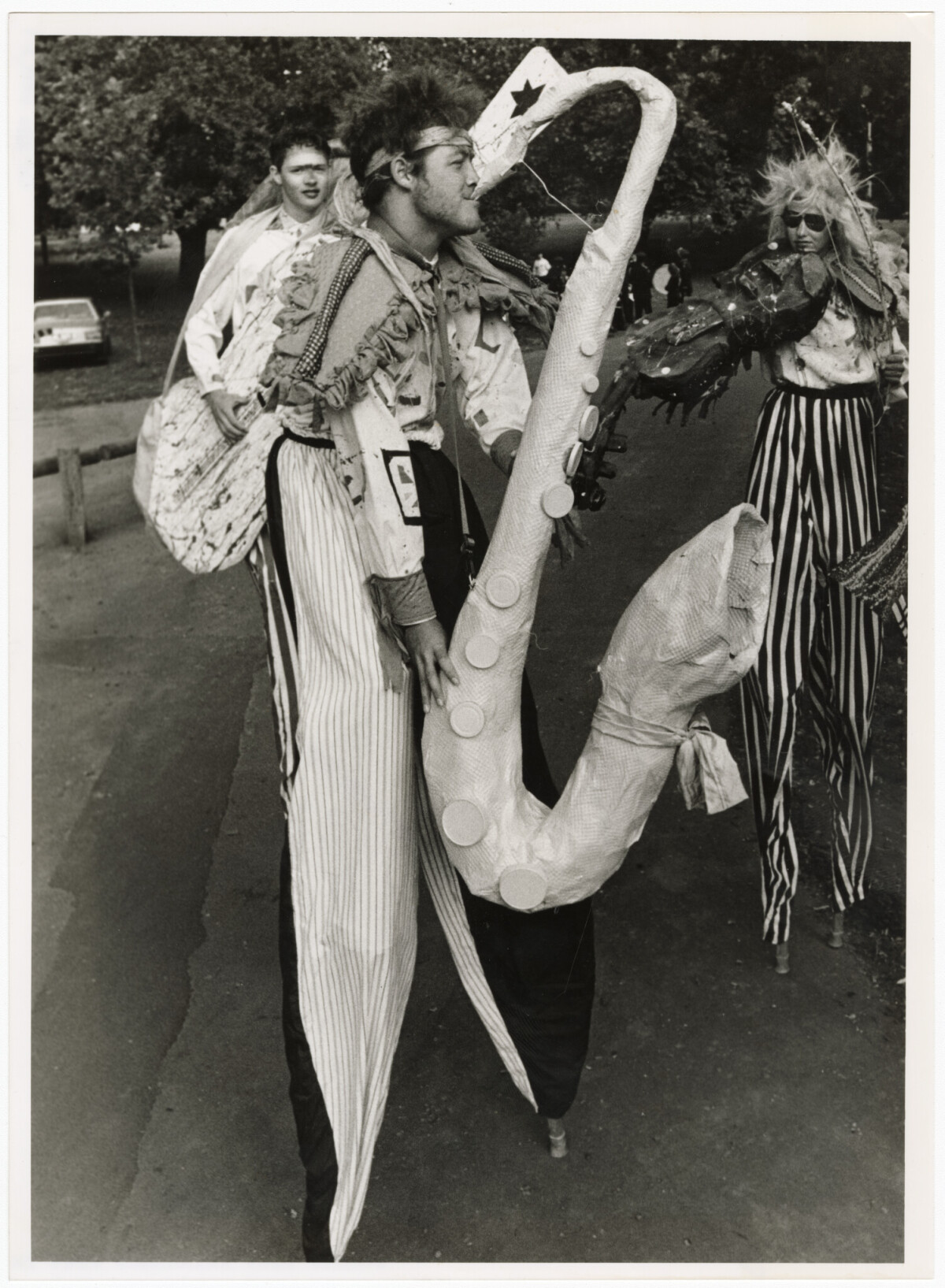 David Garrett 'playing' a fake saxophone with the Tall Order Stilt Group at the Christchurch Arts Centre market square.