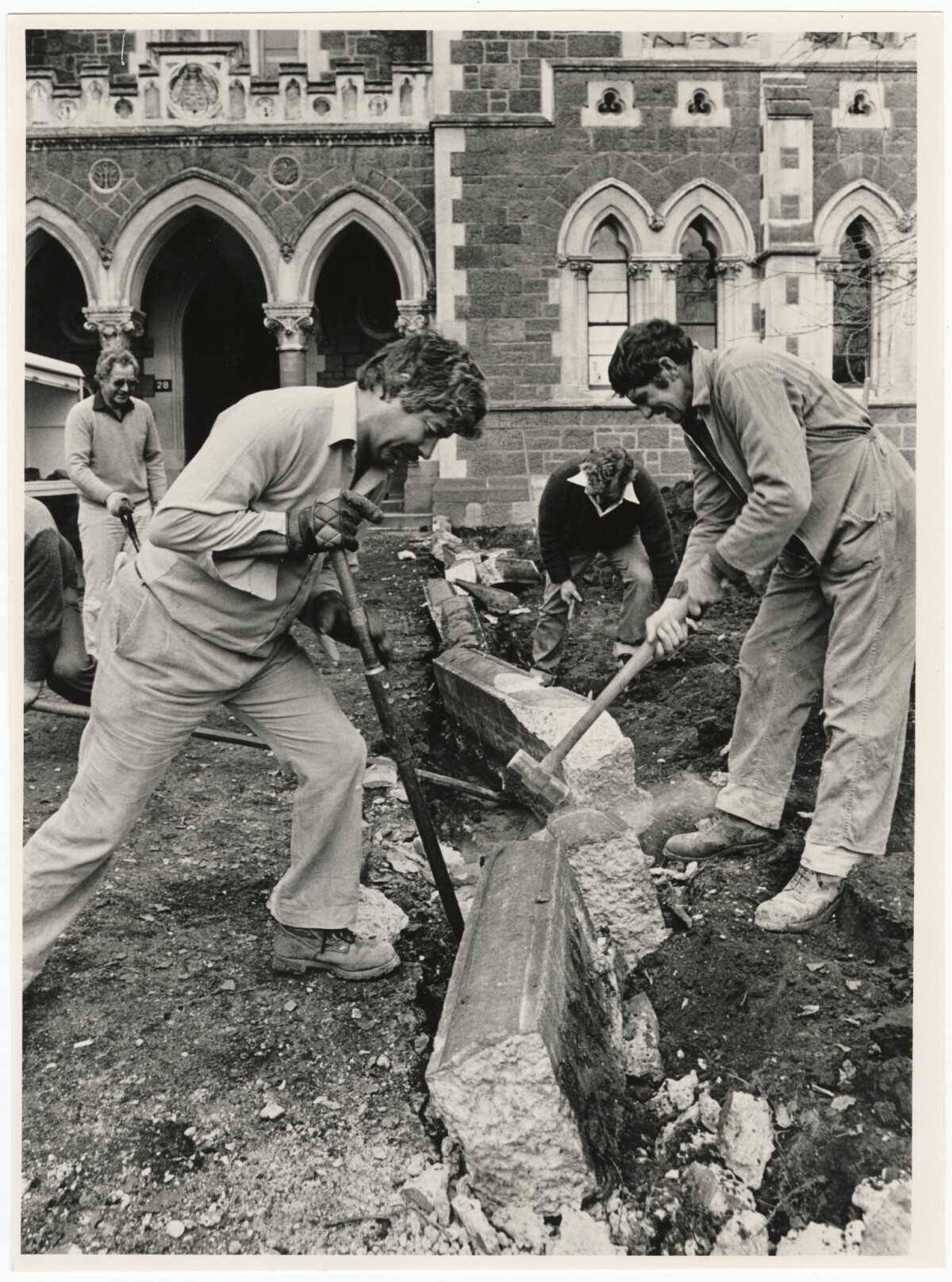 Belfast Rotary Club members demolishing curbing outside the Arts Centre on Worcester Street. The area is to be replaced with cobblestone paving to increase parking as part of Operation Arts Centre Aid, where community groups are asked to support projects at the Arts Centre. Pictured left to right, are Brian Bird, John Henderson, Raoul Smith and Geoff Wells.