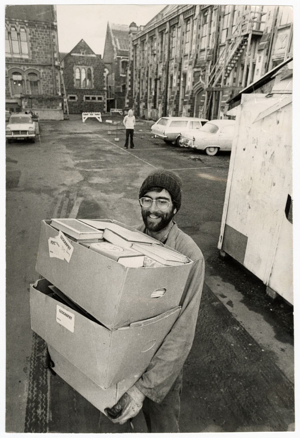 Chris James with geography department books for relocation to the University of Canterbury Ilam campus.