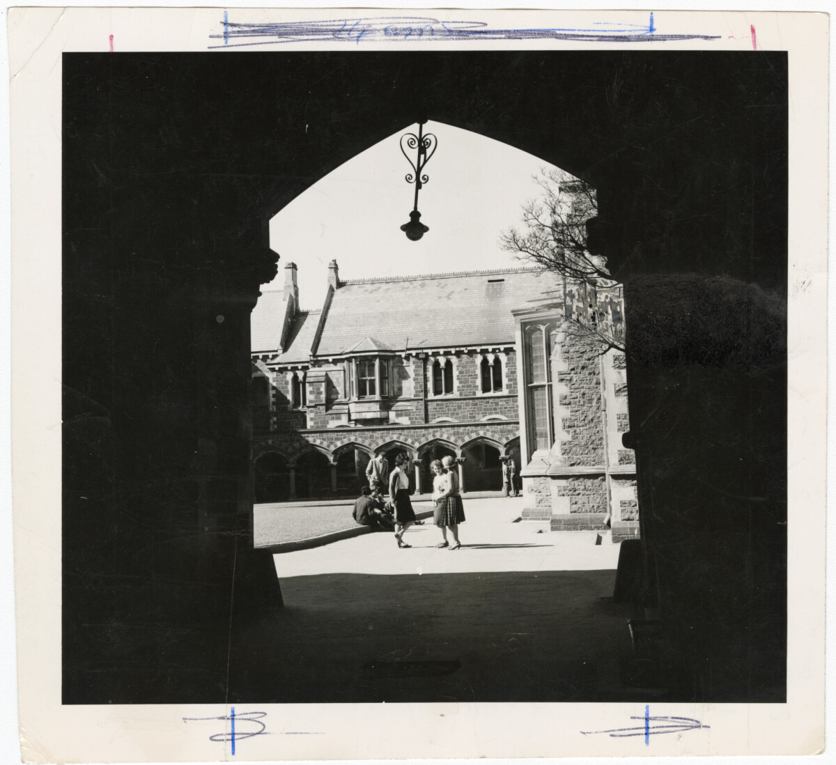 View through an archway of students in the University of Canterbury quadrangle in the central city, on the block between Rolleston Avenue, Worcester Boulevard, Montreal Street and Hereford Street.